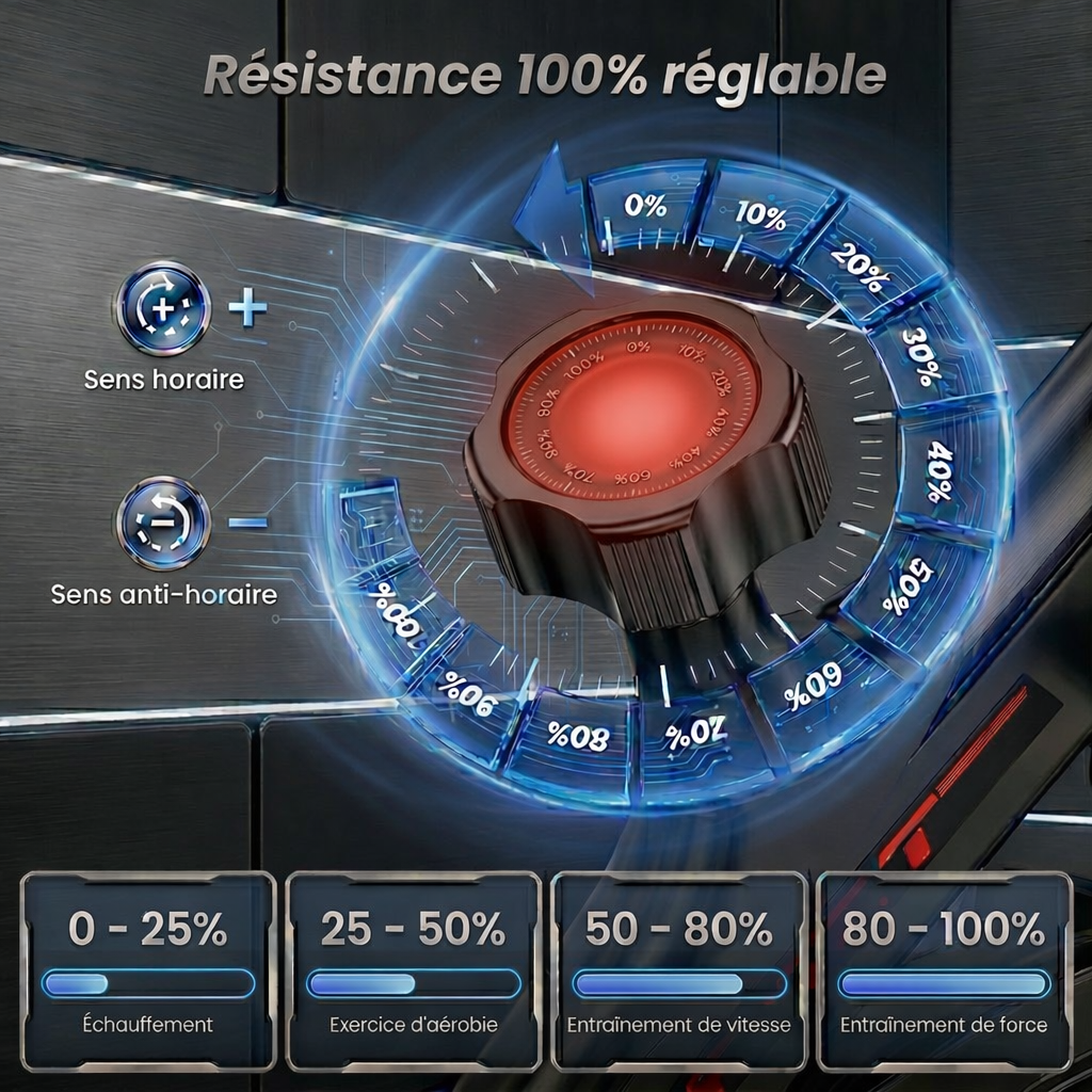 - Type de réglage : Résistance mécanique réglable de 0 % à 100 %.